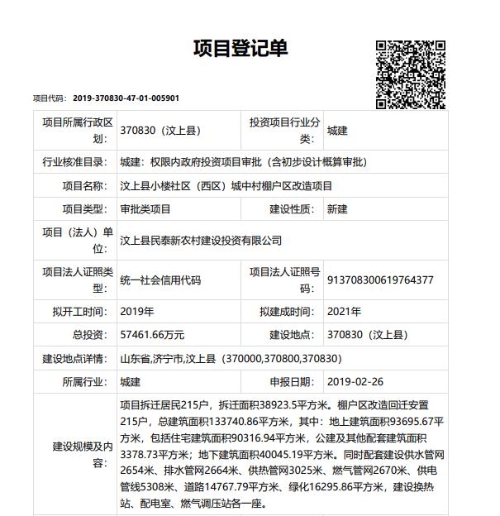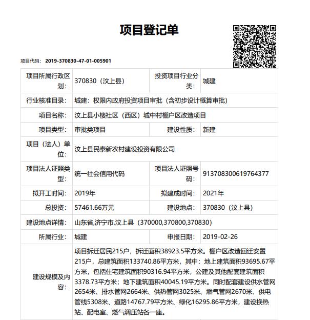 汶上縣小樓社區(西區)城中村棚戶區改造項目立項批復信息