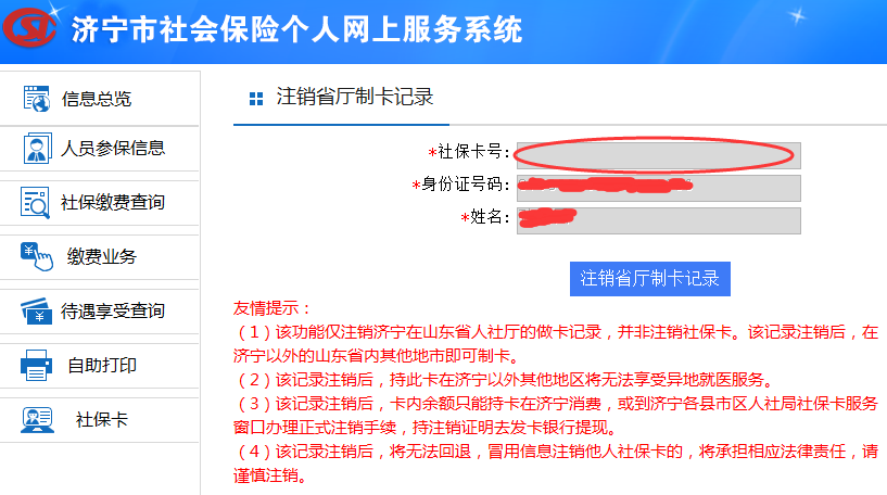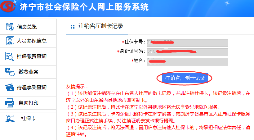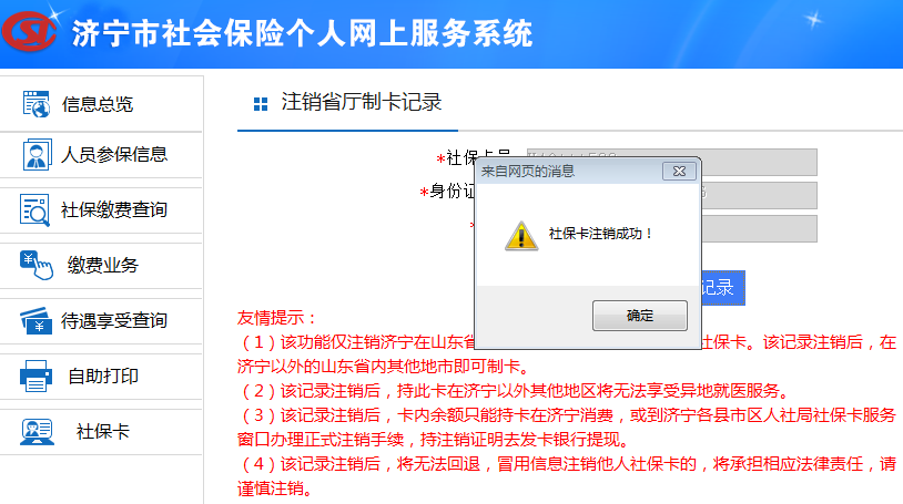 請(qǐng)注意查看頁(yè)面上的“友情提示”內(nèi)容,然后點(diǎn)擊“注銷(xiāo)省廳制卡記錄”,可以注銷(xiāo)濟(jì)寧在山東省人社廳社??ㄏ到y(tǒng)的制卡記錄,該記錄注銷(xiāo)后,在濟(jì)寧以外的山東省內(nèi)其他地市即可正常制卡。注銷(xiāo)成功后,頁(yè)面會(huì)彈出如下提示。