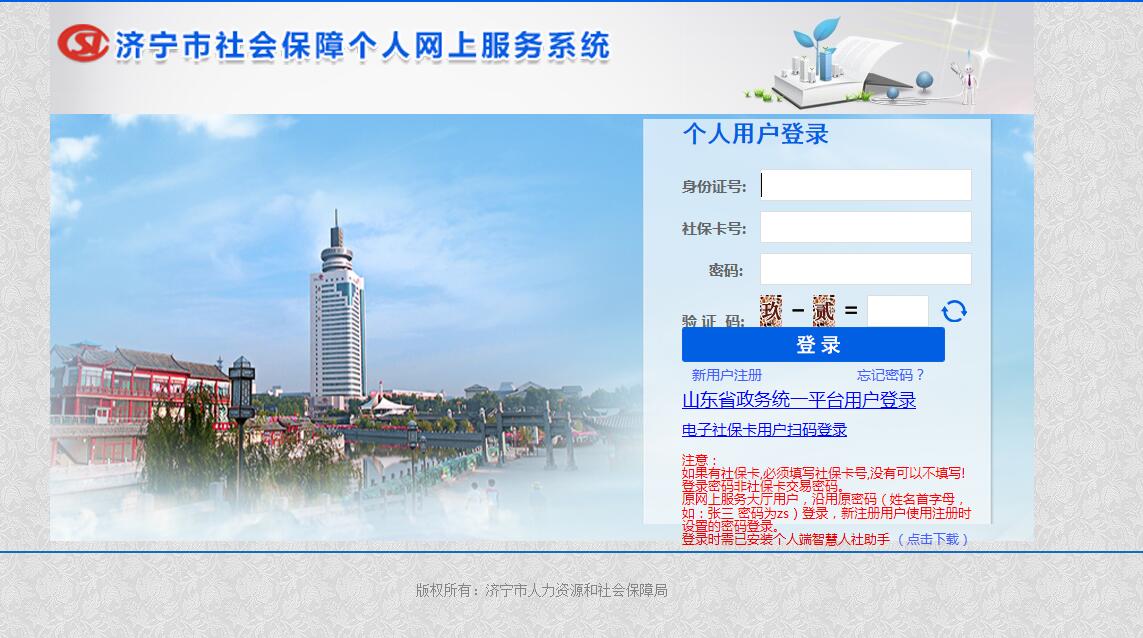 可通過(guò)三種方式登錄:輸入身份證號(hào)碼、社??ㄌ?hào)和密碼、驗(yàn)證碼,點(diǎn)擊“登錄”,或使用電子社??⊕叽a登錄,也可以使用山東省政務(wù)統(tǒng)一平臺(tái)用戶(hù)登錄,登入濟(jì)寧市社會(huì)保險(xiǎn)個(gè)人網(wǎng)上服務(wù)系統(tǒng),如下圖。社??ㄌ?hào)即社保卡卡面上的“社會(huì)保障卡號(hào)”,卡號(hào)以H開(kāi)頭如“H12345678”,或者是9位純數(shù)字如“123456789”。如果還沒(méi)有領(lǐng)到社???,可在服務(wù)大廳頁(yè)面中點(diǎn)擊“社保卡制卡進(jìn)度查詢(xún)”,輸入身份證號(hào)碼后查詢(xún)制卡領(lǐng)卡信息,也可到參保地的人社服務(wù)大廳查詢(xún)本人的社??ㄌ?hào)。