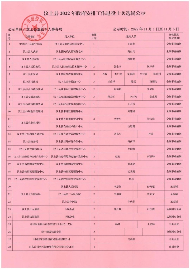 汶上縣2022年政府安排工作退役士兵選崗公示