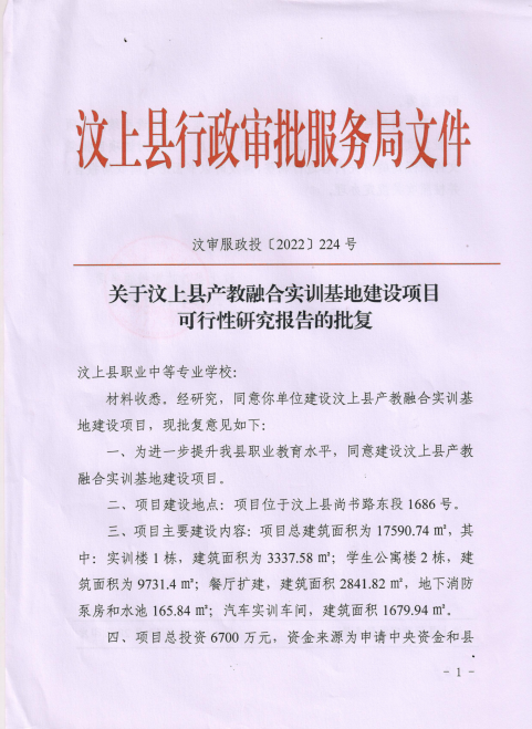 關(guān)于汶上縣產(chǎn)教融合實(shí)訓(xùn)基地建設(shè)項(xiàng)目可行性研究報(bào)告的批復(fù)