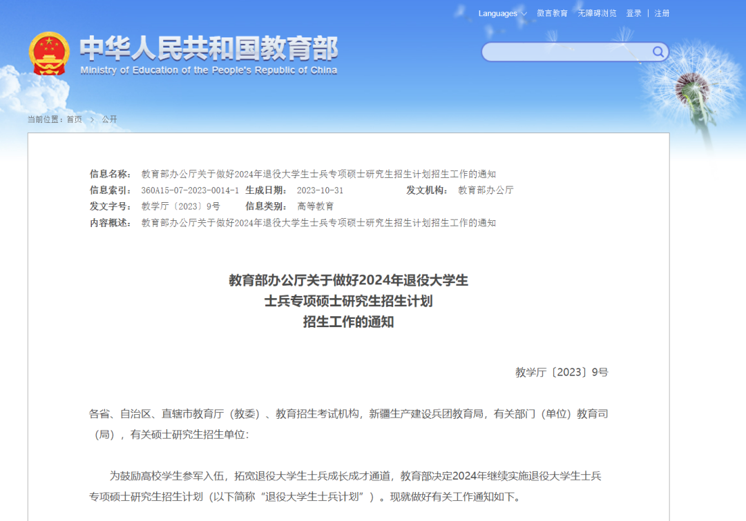 為鼓勵高校學生參軍入伍 拓寬退役大學生士兵 成長成才通道 教育部決定 2024年繼續實施 退役大學生士兵 專項碩士研究生招生計劃 嚴格執行專項計劃 “退役大學生士兵計劃”是全國碩士研究生招生工作的重要組成部分,在全國碩士研究生招生計劃總規模內單列下達、專項使用,不得調整為普通計劃或其他專項計劃,第一志愿合格生源不足的招生單位應組織調劑接受符合條件的考生報考。2024年全國“退役大學生士兵計劃”由北京大學、清華大學等520所普通高等學校承擔(招生單位名單見附件)。各招生單位要因校制宜合理確定“退役大學生士兵計劃”招生專業范圍,在碩士研究生考試招生專業目錄中予以明確并對外公布。 嚴格審核報名資格 報考“退役大學生士兵計劃”的考生,應為高校學生應征入伍退出現役且符合碩士研究生報考條件者,其中“高校學生”指全日制普通本專科(含高職)、研究生、第二學士學位的應(往)屆畢業生、在校生和入學新生,以及成人高校招收的普通本專科(含高職)應(往)屆畢業生、在校生和入學新生。考生在報名時應按要求填報本人入伍前的入學信息以及入伍、退役等相關信息。有關部門和招生單位應按照規定的程序和要求開展考生報名資格審核。 嚴格執行招生政策 各招生單位要按照“自愿報名、統一招考、自主劃線、擇優錄取”的原則,依據《教育部關于印發〈2024年全國碩士研究生招生工作管理規定〉的通知》(教學〔2023〕2號)要求,嚴格規范做好“退役大學生士兵計劃”招生錄取工作,確保公平公正和招生質量。 開展“退役大學生士兵計劃”調劑工作的招生單位,須嚴格執行調劑政策及程序。報考“退役大學生士兵計劃”的考生,申請調劑到普通計劃,其初試成績須達到調入地區相關專業所在學科門類的全國初試成績基本要求。符合條件的,可按規定享受退役大學生士兵初試加分政策。報考普通計劃的考生,若符合“退役大學生士兵計劃”報考條件,可申請調劑到該專項計劃,其初試成績須符合相關招生單位確定的接受“退役大學生士兵計劃”考生調劑的初試成績要求。所有調劑工作均須通過教育部“全國碩士生招生復試調劑服務系統”進行,嚴禁招生單位直接改變考生志愿、調整計劃類型進行復試錄取,嚴禁招生單位通過其他渠道接收調劑考生。 加強指導監督檢查 各省級教育行政部門、教育招生考試機構要加強對本地區相關招生單位“退役大學生士兵計劃”招生工作的指導和監督,重點加強對專項計劃執行、考生資格審核、調劑組織、復試錄取、信息公開等關鍵環節的檢查,確保專項計劃招生工作規范透明、公平公正。 優化考生服務保障 各招生單位要將“退役大學生士兵計劃”相關政策要求納入本單位招生章程中提前公布,并充分利用“中國研究生招生信息網”(網址:https://yz.chsi.com.cn)和本單位網站等渠道,做好政策宣傳解讀、咨詢答復等服務保障工作。要提醒報考“退役大學生士兵計劃”的考生,網上確認前應到安置地鄉鎮(街道)退役軍人服務站完成退役軍人建檔立卡信息登記,避免因登記信息不準確影響后續確認和考試錄取工作。要暢通考生申訴渠道,建立完善接訴即辦機制,對相關申訴及時回應處理。 文章來源:“國家退役軍人課堂”公眾號 素材來源:教育部 |