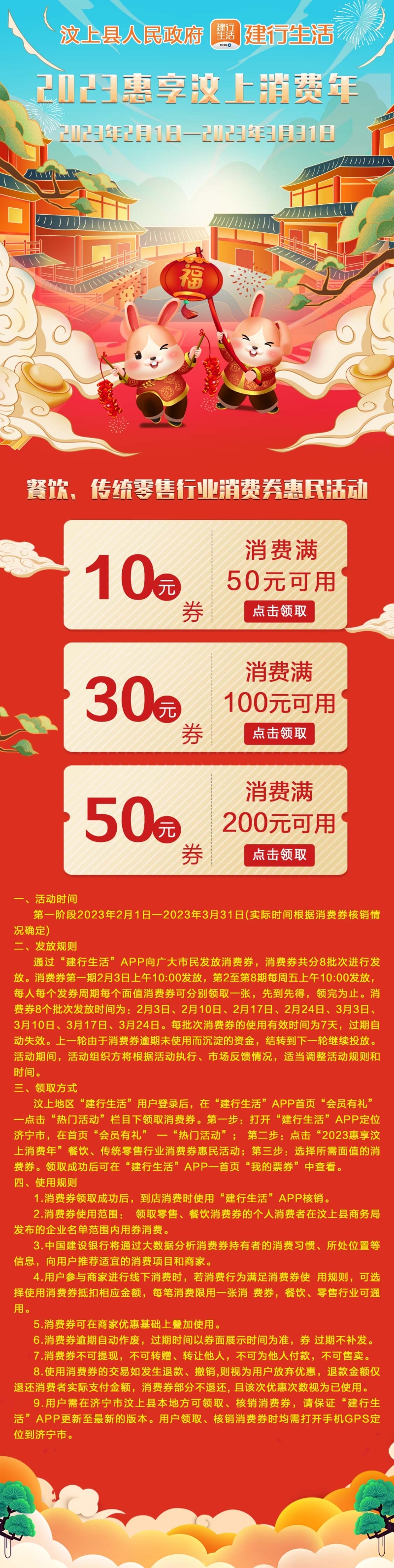 關于開展2023惠享汶上消費年”餐飲、傳統零售行業消費券惠民活動的通知 各鄉鎮(街道),縣直有關部門,駐汶各單位,有關企業: 為貫徹落實中央和省委、市委、縣委經濟工作會議精神,提振公眾消費意愿,護航企業恢復經營,助力推動消費回升,經縣政府同意,決定開展“2023惠享汶上消費年”餐飲、傳統零售行業消費券惠民活動。活動內容如下: 一、活動時間: 第一階段2023年2月1日—2023年3月31日(實際時間根據消費券核銷情況確定) 二、發放規則: 通過“建行生活”APP向廣大市民發放消費券,消費券共分8批次進行發放。消費券第一期2月3日上午10:00發放,第2至第8期每周五上午10:00發放,每人每個發券周期每個面值消費券可分別領取一張,先到先得,領完為止。消費券8個批次發放時間為:2月3日、2月10日、2月17日、2月24日、3月3日、3月10日、3月17日、3月24日。每批次消費券的使用有效時間為7天,過期自動失效。上一輪由于消費券逾期未使用而沉淀的資金,結轉到下一輪繼續投放。活動期間,活動組織方將根據活動執行、市場反饋情況,適當調整活動規則和時間。 三、領取方式: 汶上地區“建行生活”用戶登錄后,在“建行生活”APP首頁“會員有禮”— 點擊“熱門活動”欄目下領取消費券。第一步:打開“建行生活”APP定位濟寧市,在首頁“會員有禮”—“熱門活動”;第二步:點擊“2023惠享汶上消費年”餐飲、傳統零售行業消費券惠民活動;第三步:選擇所需面值的消費券。領取成功后可在“建行生活”APP—首頁“我的票券”中查看。 四、使用規則: 1.消費券領取成功后,到店消費時使用“建行生活”APP核銷。 2.消費券使用范圍:領取零售、餐飲消費券的個人消費者在汶上縣商務局發布的企業名單范圍內用券消費。 3.中國建設銀行將通過大數據分析消費券持有者的消費習慣、所處位置等信息,向用戶推薦適宜的消費項目和商家。 4.用戶參與商家進行線下消費時,若消費行為滿足消費券使 用規則,可選擇使用消費券抵扣相應金額,每筆消費限用一張消 費券,餐飲、零售行業可通用。 5.消費券可在商家優惠基礎上疊加使用。 6.消費券逾期自動作廢,過期時間以券面展示時間為準,券 過期不補發。 7.消費券不可提現,不可轉贈、轉讓他人,不可為他人付款,不可售賣。 8.使用消費券的交易如發生退款、撤銷,則視為用戶放棄優惠,退款金額僅退還消費者實際支付金額,消費券部分不退還, 且該次優惠次數視為已使用。 9.用戶需在濟寧市汶上縣本地方可領取、核銷消費券,請保證“建行生活”APP更新至最新的版本。用戶領取、核銷消費券時均需打開手機GPS定位到濟寧市。 請各鄉鎮(街道),縣直有關部門,駐汶各單位,有關企業積極參與,廣泛利用各類媒體發布消費券活動信息,提高群眾知曉率和參與度,營造良好消費氛圍。通過政府推動、市場拉動,增強經濟發展內生動力,讓市場主體和消費主體得到優惠,讓汶上人民共享消費紅利。