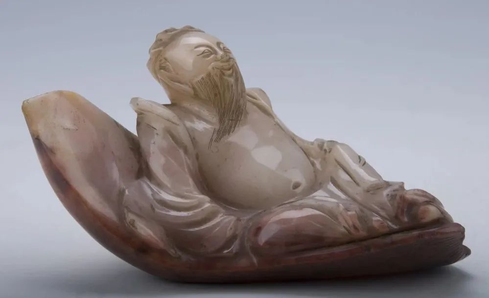 此雕刻為人物,系瑪瑙巧雕。整塊瑪瑙雕一老漢臥于蕉葉形座椅上。人體部分為白色,蕉葉部分為深紅色。老漢頭扎幘巾,面帶微笑,面容慈祥,長須飄于胸前,坦胸大腹,外披衣衫,左手握一書卷,右手搭放在座椅上,悠然自得。整個作品雕刻精細,技法嫻熟,人物栩栩如生,是一件難得的藝術品。瑪瑙人為清代擺件,三級文物,現存于汶上縣博物館。