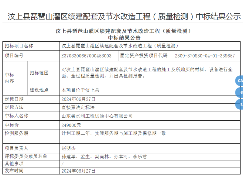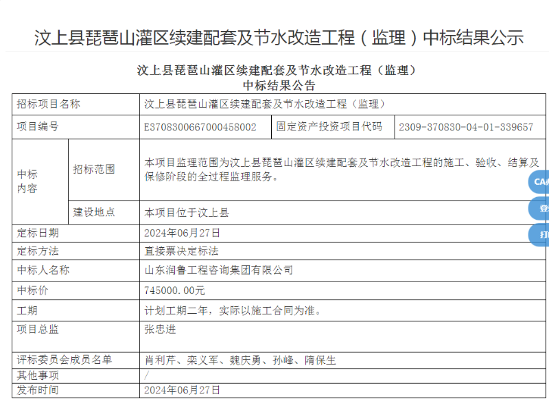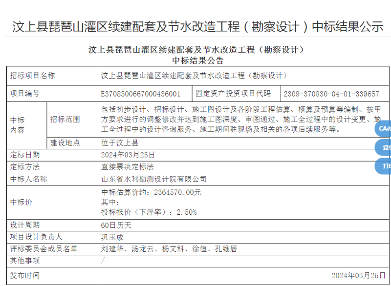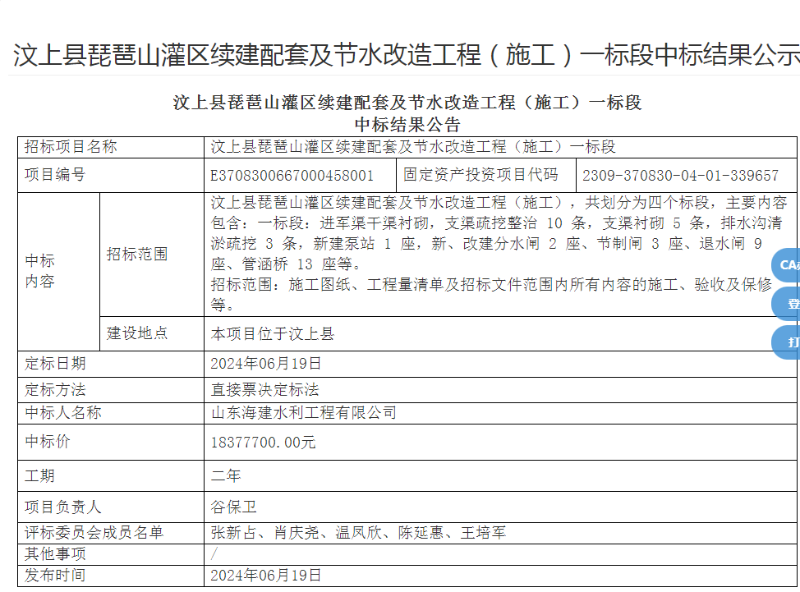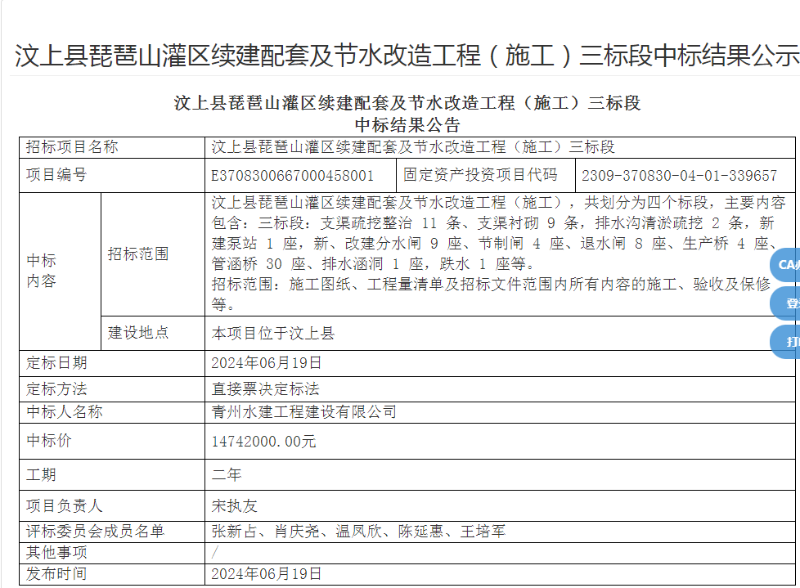 汶上縣琵琶山灌區續建配套及節水改造工程招標投標信息