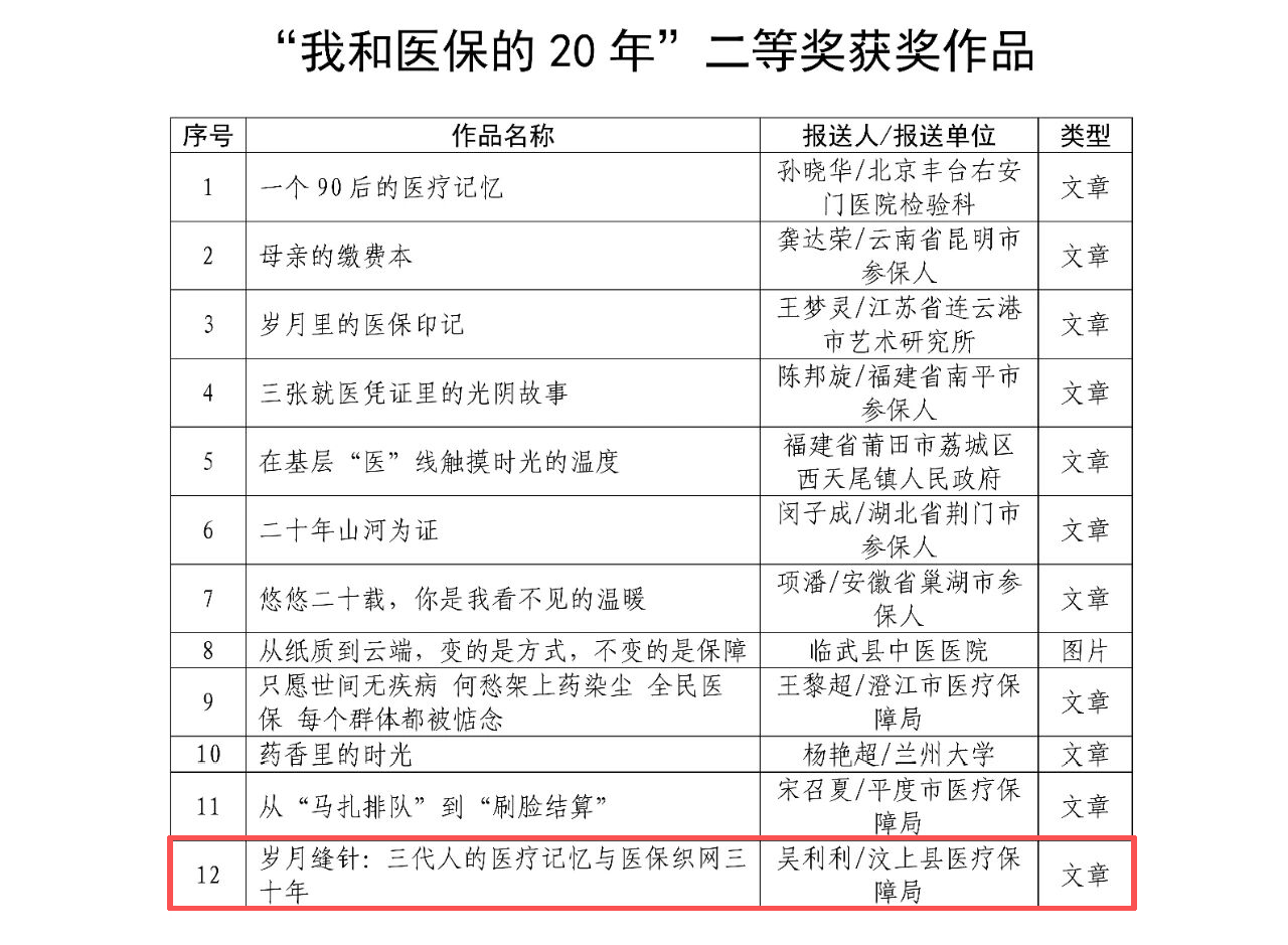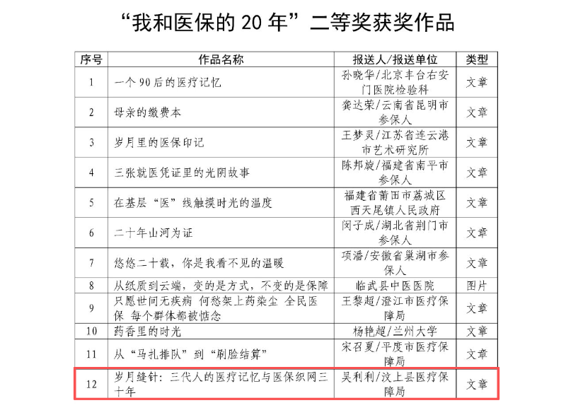 今年5月,國家醫保局開展“我和醫保的20年”優秀作品征集活動,汶上縣醫療保障局申報的《歲月縫針:三代人的醫療記憶與醫保織網三十年》榮獲國家醫保局二等獎,全市唯一。