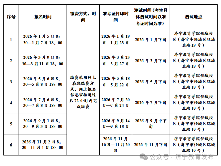 為滿足廣大考生參加普通話水平測(cè)試的需求,進(jìn)一步提升山東省普通話水平測(cè)試社會(huì)服務(wù)中心服務(wù)水平,做好2026年普通話水平測(cè)試工作,根據(jù)我市實(shí)際,特制定如下方案。 一、測(cè)試時(shí)間、地點(diǎn)安排 濟(jì)寧市2026年面向社會(huì)人員的普通話水平測(cè)試計(jì)劃安排6期。具體安排如下: 二、報(bào)名范圍 凡在我省工作、生活的人員(港澳臺(tái)人員和外籍人員需在我省學(xué)習(xí)、工作、生活3個(gè)月以上),均可按規(guī)定的測(cè)試時(shí)間,報(bào)名參加測(cè)試。 特別提醒:根據(jù)《山東省普通話培訓(xùn)測(cè)試機(jī)構(gòu)管理辦法》規(guī)定,高校學(xué)生不在報(bào)名范圍之內(nèi)。 三、報(bào)名方式及報(bào)名流程 1.報(bào)名方式:測(cè)試采用網(wǎng)上報(bào)名方式。 2.報(bào)名流程:考生登錄“國(guó)家普通話水平測(cè)試在線報(bào)名系統(tǒng)”(http://bm.cltt.org)進(jìn)行報(bào)名,首次登錄需要進(jìn)行注冊(cè)。具體流程為:登錄賬號(hào)→報(bào)名入口→山東→我要報(bào)名→山東省普通話培訓(xùn)測(cè)試社會(huì)服務(wù)中心→測(cè)試時(shí)間→閱讀報(bào)名須知→填寫(xiě)報(bào)名信息(所在單位一欄填寫(xiě)工作單位或家庭住址)→信息核對(duì)→信息審核通過(guò)→在線繳費(fèi)→報(bào)名查詢。考生依據(jù)相應(yīng)測(cè)試日期任務(wù)進(jìn)行報(bào)名,個(gè)人具體測(cè)試時(shí)間以準(zhǔn)考證為準(zhǔn)。 3.報(bào)名注意事項(xiàng) (1)照片要求為本人近期免冠白底電子版照片,規(guī)格為390×567像素,支持JPG/JPEG/PNG格式,1M以內(nèi)。照片要求清晰、端莊、正面、免冠、白底彩色(參照證件照標(biāo)準(zhǔn)),不符合要求的照片將審核不通過(guò),該照片為準(zhǔn)考證照片。考試當(dāng)天現(xiàn)場(chǎng)采集照片為證書(shū)照片,采集后照片后期不能修改,請(qǐng)合理著裝。 (2)“從事職業(yè)”一欄選擇考生目前所從事職業(yè),無(wú)對(duì)應(yīng)項(xiàng)的考生選擇“社會(huì)其他人員—其他類”。“所在單位”一欄填寫(xiě)考生單位名稱,未參加工作的考生填寫(xiě)家庭住址。 (3)帶*的欄目為必填內(nèi)容,填寫(xiě)報(bào)名信息時(shí),考生信息務(wù)必正確填寫(xiě)。 (4)在線報(bào)名信息填報(bào)后,考生還需通過(guò)報(bào)名網(wǎng)站上方“報(bào)名查詢”及時(shí)查看個(gè)人報(bào)名信息審核情況,審核通過(guò)需要在線繳費(fèi),如有審核不通過(guò)或者審核待修改信息,請(qǐng)及時(shí)處理。報(bào)名截止后未及時(shí)修改的系統(tǒng)自動(dòng)取消報(bào)名信息。報(bào)名時(shí)間截止,系統(tǒng)將自動(dòng)關(guān)閉。 (5)測(cè)試前一周左右,考生登錄“國(guó)家普通話水平測(cè)試在線報(bào)名系統(tǒng)”(http://bm.cltt.org),進(jìn)入后在頁(yè)面上方點(diǎn)擊“準(zhǔn)考證打印”,完成準(zhǔn)考證打印。 四、測(cè)試費(fèi)用標(biāo)準(zhǔn)及繳費(fèi)流程 普通話水平測(cè)試收費(fèi)標(biāo)準(zhǔn)按山東省發(fā)展和改革委員會(huì)、山東省財(cái)政廳《關(guān)于明確普通話水平測(cè)試收費(fèi)標(biāo)準(zhǔn)的通知》(魯發(fā)改成本〔2022〕222號(hào))文件規(guī)定執(zhí)行,每人次50元。測(cè)試?yán)U費(fèi)采取在線繳費(fèi),請(qǐng)考生在信息審核通過(guò)后72小時(shí)內(nèi)完成繳費(fèi),未及時(shí)繳費(fèi)的系統(tǒng)自動(dòng)取消報(bào)名。如本人棄考或個(gè)人原因未按時(shí)參加考試,不予退款。 五、測(cè)試方式、流程 1.測(cè)試方式:本次測(cè)試按照國(guó)家語(yǔ)委規(guī)定,從2023年4月1日起啟用新的測(cè)試系統(tǒng)進(jìn)行測(cè)試。采用人臉?lè)雷鞅紫到y(tǒng),考生需配合測(cè)試中心采集人臉信息后方能登錄考試。同時(shí)新規(guī)程取消了備測(cè)室和備測(cè)時(shí)間。考生在信息采集時(shí),由系統(tǒng)隨機(jī)分配考試機(jī)位和考試試卷,請(qǐng)各位考生做好充分的測(cè)前準(zhǔn)備。考生可在報(bào)名網(wǎng)站查看“測(cè)前須知”,了解測(cè)試詳細(xì)內(nèi)容。題型包括讀單音節(jié)字詞、讀多音節(jié)詞語(yǔ)、朗讀短文、命題說(shuō)話。第四道命題說(shuō)話有2道題目,考生需在測(cè)試環(huán)節(jié)中自主勾選,否則默認(rèn)為第一道題,考生勾選后有30秒的時(shí)間準(zhǔn)備(不得使用紙筆),說(shuō)話時(shí)長(zhǎng)為3分鐘。 2.測(cè)試流程為:考生報(bào)到→核對(duì)證件→候測(cè)→信息采集→測(cè)試→離場(chǎng)。 3.現(xiàn)場(chǎng)測(cè)試:測(cè)試時(shí)間、地點(diǎn)以準(zhǔn)考證為準(zhǔn),請(qǐng)考生持準(zhǔn)考證和身份證原件,提前30分鐘到指定考場(chǎng)報(bào)到。信息采集現(xiàn)場(chǎng)需刷身份證,請(qǐng)考生考前準(zhǔn)備好身份證原件,無(wú)身份證或臨時(shí)身份證不得參加考試。遲到30分鐘以上者,原則上應(yīng)取消當(dāng)次測(cè)試資格。 六、成績(jī)查詢及證書(shū)發(fā)放 1.成績(jī)查詢:測(cè)試結(jié)束后30個(gè)工作日左右(如有一級(jí)甲等的成績(jī)認(rèn)定順延15個(gè)工作日),考生可登錄“國(guó)家普通話水平測(cè)試信息網(wǎng)”(https://www.cltt.org/#/scoreQuery)或“國(guó)家普通話水平測(cè)試在線報(bào)名