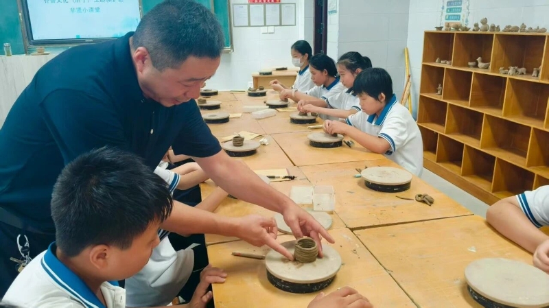 孫氏彩塑非遺小課堂上,傳承人孫連軍手持陶土,一邊念著自編的技藝口訣,一邊放慢動作演示。作為市級非遺項目,孫氏彩塑以造型生動、色彩明快著稱,既保留了傳統民俗元素,又融入現代審美趣味。課堂上,孫連軍從最基礎的揉泥、捏形教起,再到細節塑形、簡單上色,每一個步驟都配合清晰的手勢演示和耐心講解。在他的指導下,原本普通的陶土在同學們手中漸漸活了起來,孩子們的臉上也洋溢著成就感。