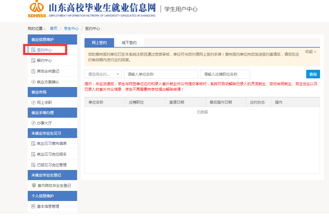 3、進(jìn)入到學(xué)生用戶中心后,在就業(yè)信息維護(hù)下面的“簽約中心”與簽約單位進(jìn)行簽約,完成網(wǎng)上簽約。