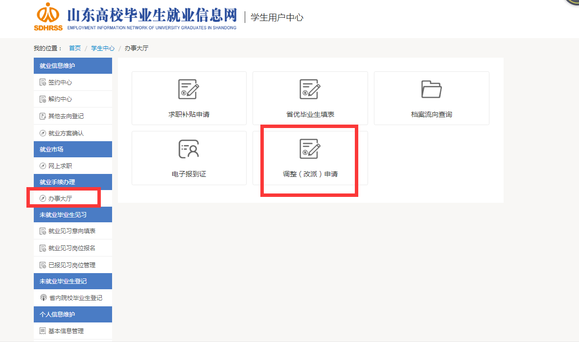 4、在就業(yè)手續(xù)辦理的“辦事大廳”下面選擇“調(diào)整(改派)申請(qǐng)”,待人社部門(mén)審核通過(guò)后,學(xué)生可以通過(guò)“辦事大廳”下的“電子報(bào)到證”欄目下載打印新的電子報(bào)到證。