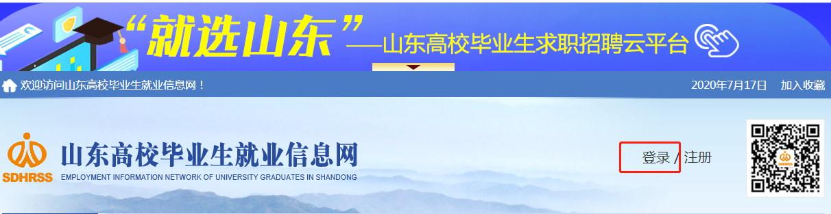 1、通過(guò)網(wǎng)頁(yè)登錄山東高校畢業(yè)生就業(yè)信息網(wǎng)(網(wǎng)址www.sdgxbys.cn),點(diǎn)擊右上角“登錄”,進(jìn)入到“登錄頁(yè)面”;