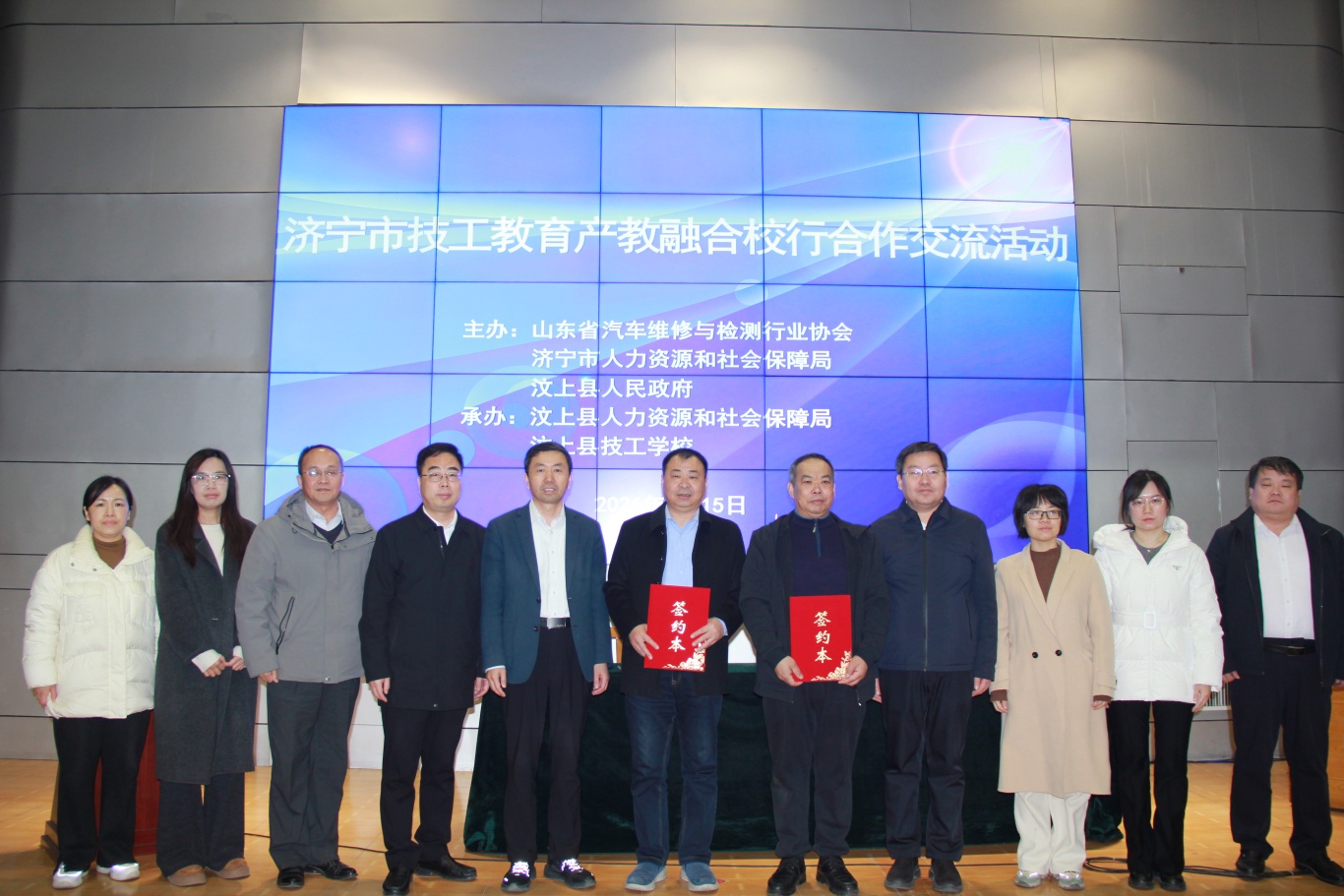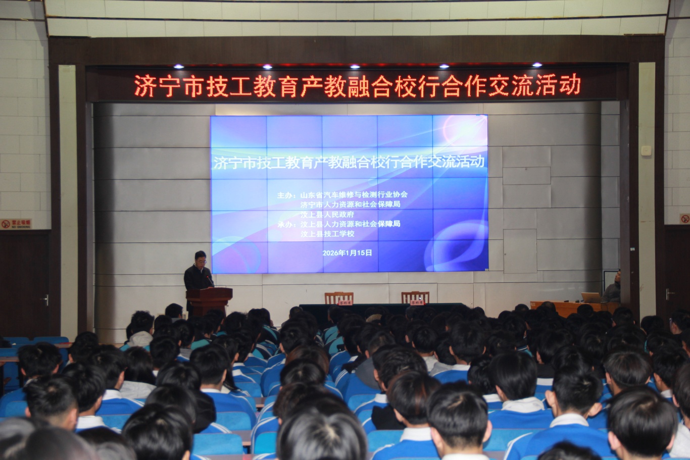2026年1月15日上午,濟寧市技工教育產教融合校行合作交流活動在汶上縣技工學校成功舉行。濟寧市人社局副局長蔣紅星,汶上縣委常委、副縣長趙紅雨,山東省汽車維修與檢測行業協會會長、山東交通學院教授鐘兵,縣技工學校校長李福坤,汶上縣委組織部副部長、縣人社局黨組書記、局長趙華等出席儀式,學校師生代表共同見證這一重要時刻。